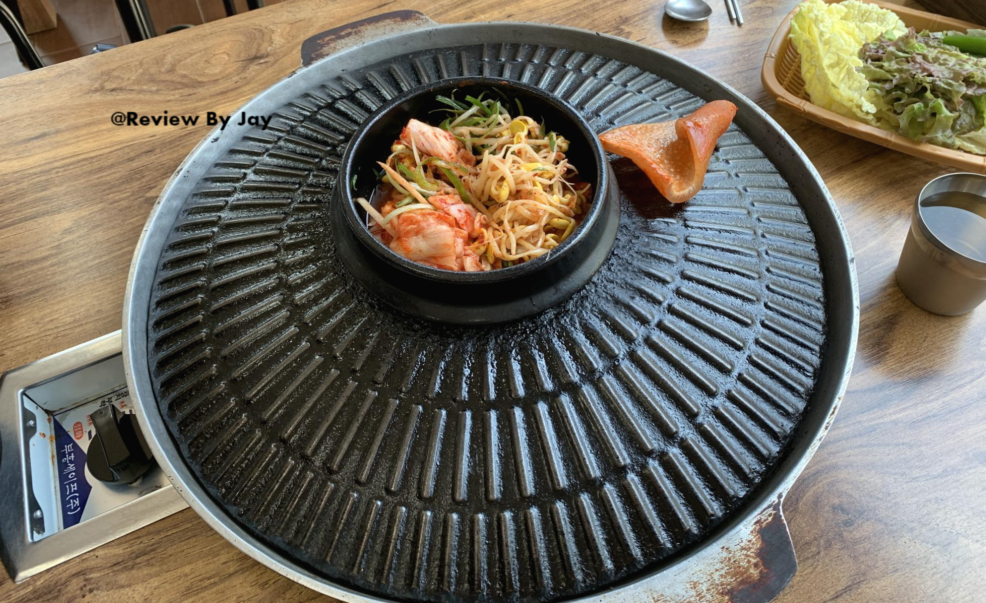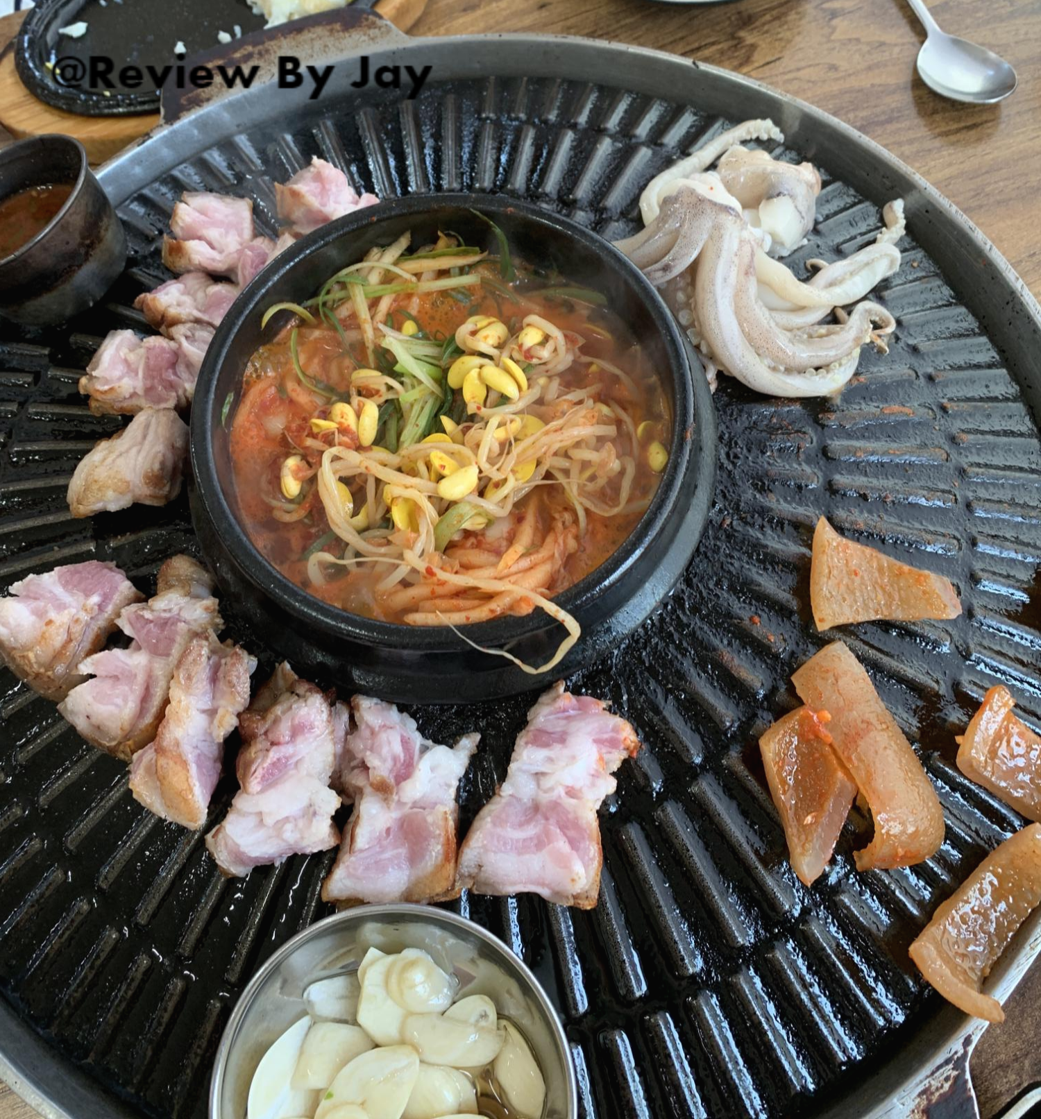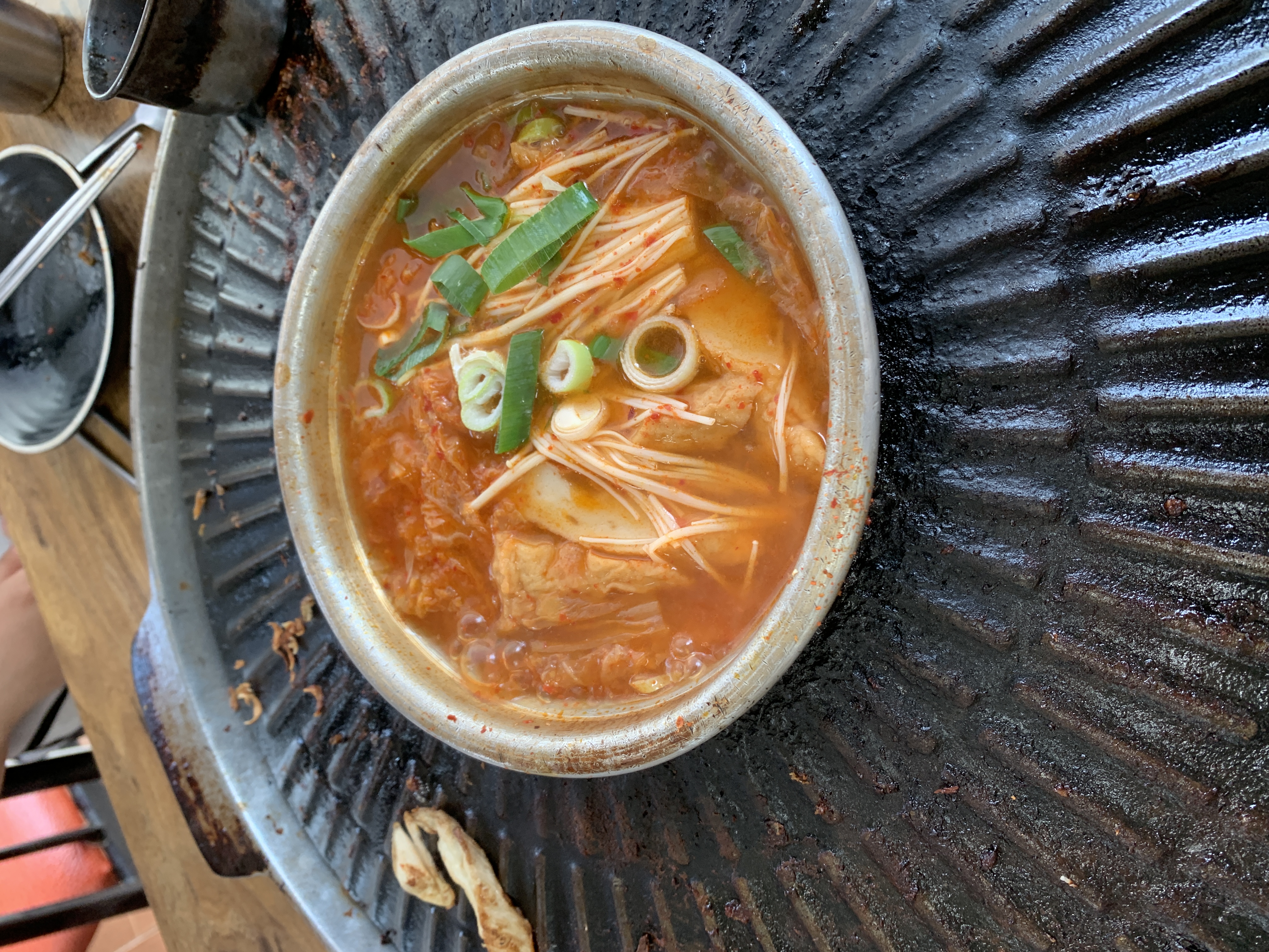 가운데는 쪼린 찌개라고 보시면 될거같습니다. 메콤한게 고기랑 같이 먹기에 좋습니다. 김치 콩나물 등등이 들어있습니다. 그리고 시작하면 바로!! 껍데기 한쪽을 먼저 주십니다.