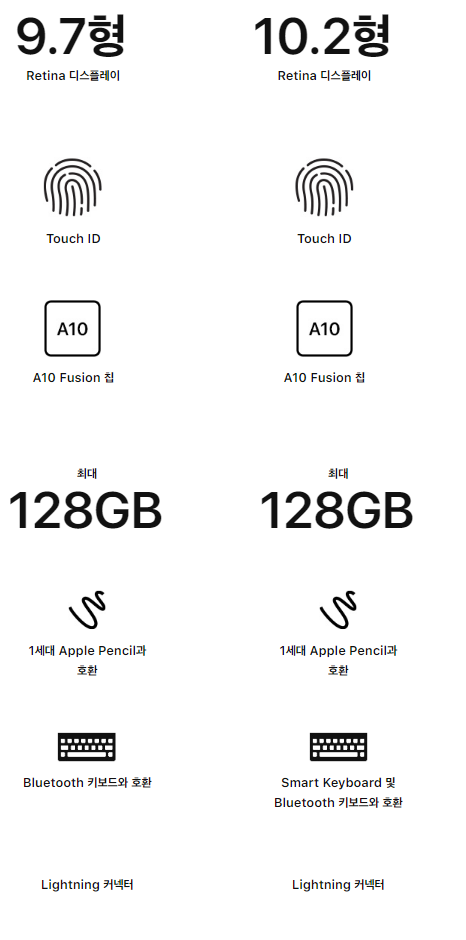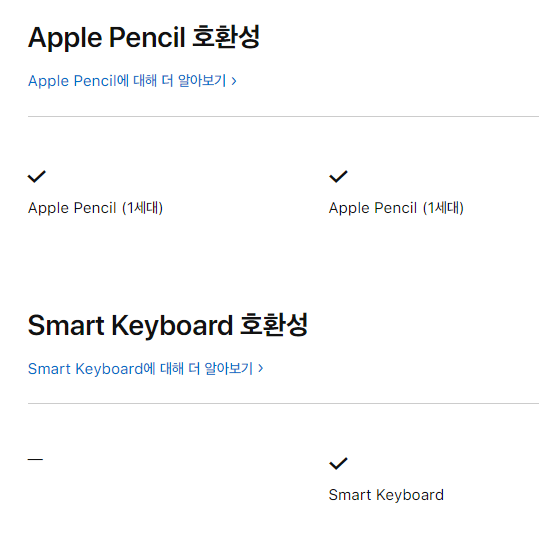 apple pencil 똑같이 1 세대만 , 스마트 키보드만 추가적으로 7세대 ipad에 사용 가능. (그냥 다른 키보드 쓰면된다..)