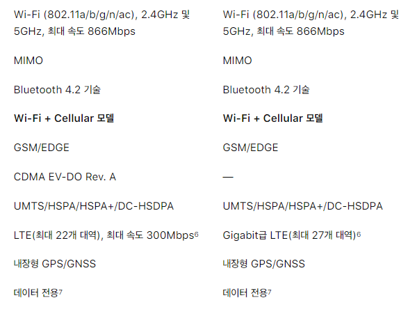 통신관련엔, 기가 LTE 추가 - wifi 모델에서는 상관없는 스펙