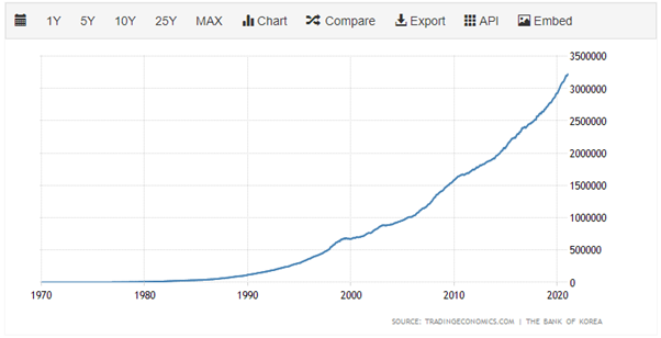 한국의 경우 M2 상황이 어떤지 확인해보면 아직까지는 무난?하게 10년마다 2배정도의 성장을 보이고 있다. 크게 걱정되는 point는 과연 한국은 이러한 상황에 무슨 대비를 하고 있을지이다. 한국은 미국과 다른 큰 차이점은 가구당 자산에서 부동산이 차지하는 비율이다. 2020년 자료지만 확인해보면 전체 자산에서 76%를 차지하고 있다. 이런경우에 돈을 찍어낸다면 자연스럽게 그 돈은 부동산으로 흘러가게 되는데, 안그래도 지난 몇 년간 부동산 가격이 계속 폭등하는 중이라 유주택자 무주택자의 갈등도 점점 커지는 중이다. 이제 한국 사람들도 집가진게 좋다는 인식이 널리 퍼졌기 때문에 임대를 공급하겠다는 정당이 표를 얼마나 받을지도 주목해봐야된다.