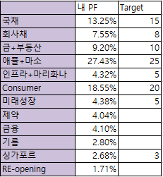 올해 비중 Target은 다음과 같다. 미국채는 내 평생 유지할 PF의 바닥이라 생각하기에.. 요새 애플 마소가 달려줘서 비중이 조금 깨진면이 있다. 이 둘 주식을 매도할 생각은 전혀 없으므로(...) 월급+성과급으로 비중을 만들어주려고 한다.