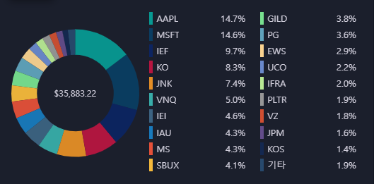 매수 : IEI 1ea, MSFT 1ea, CCL 5ea, AAPL 1ea, KO 2ea, EWS 5ea, VZ 1ea, JPM 1ea, PG 1ea, PLTR 5ea,