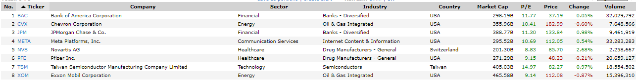 BAC, CVXX, JPM, META, NVS, PFE, TSM, XOM