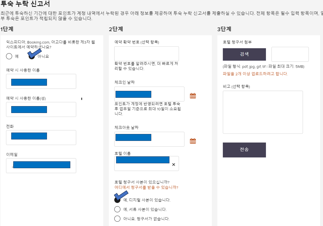 확인해보니 직접 투숙 누락 신고서(Missing Stay Request)를 작성해야된다고 합니다.