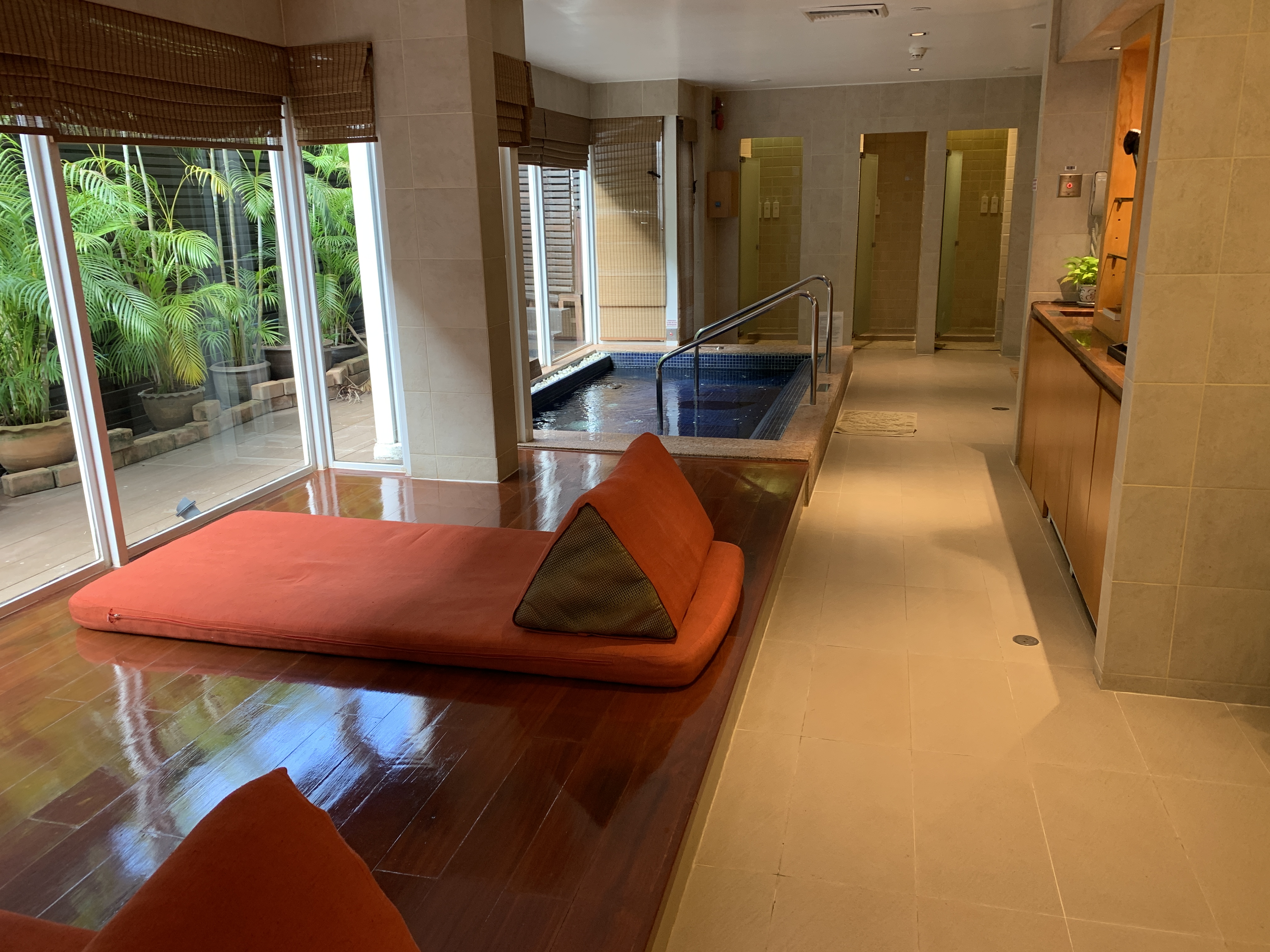 숙박하는 곳 건너편에 헬스장과 Spa, 요리학교 등이 있습니다. 배를타고 건너가서 조금 걸어 들어가면 대나무로 꾸며진 길이 보이는데 바로 저 건물이 헬스장입니다. 안에 라커와 함께 샤워 + 간단한 사우나 등이 준비되어 있습니다.